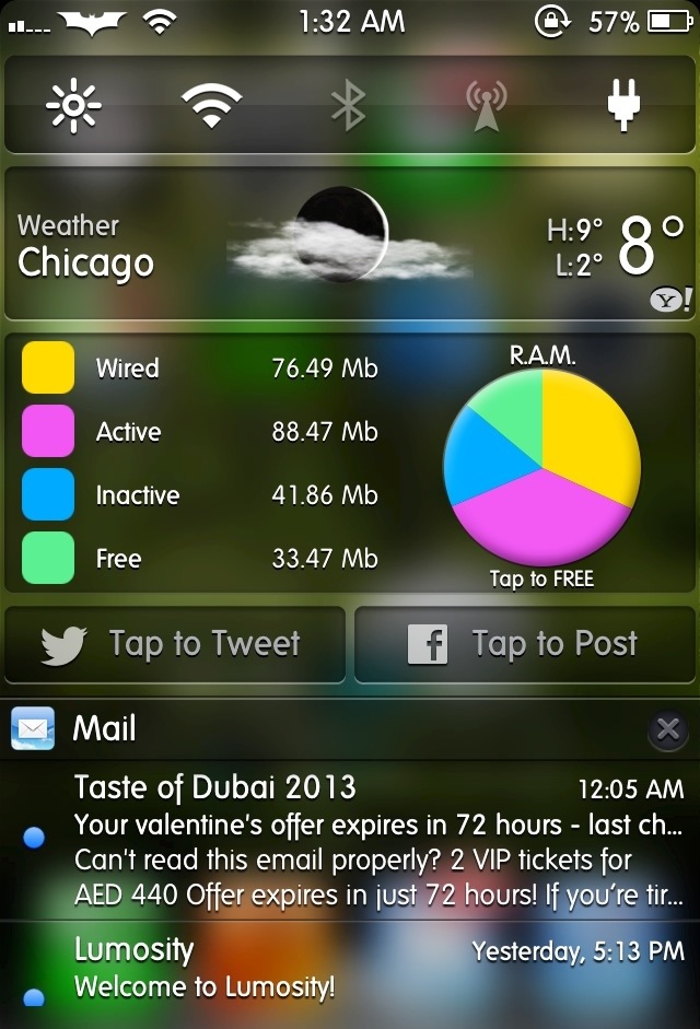 brings several System Settings toggles to Notification Center such as toggles for Wi-Fi, Volume, Brightness, Orientation Lock, Location Services, Bluetooth, Airplane Mode, and Respring to Notification Center.